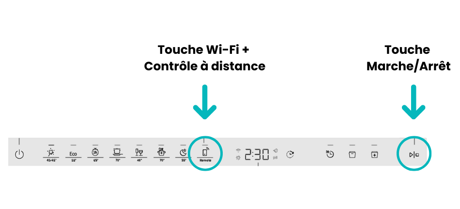2. Appuyez sur la touche Wi-Fi de votre lave-vaisselle pour activer le mode Remote Control. Selon le modèle, il peut être nécessaire d’appuyer également sur la touche Start/Stop.